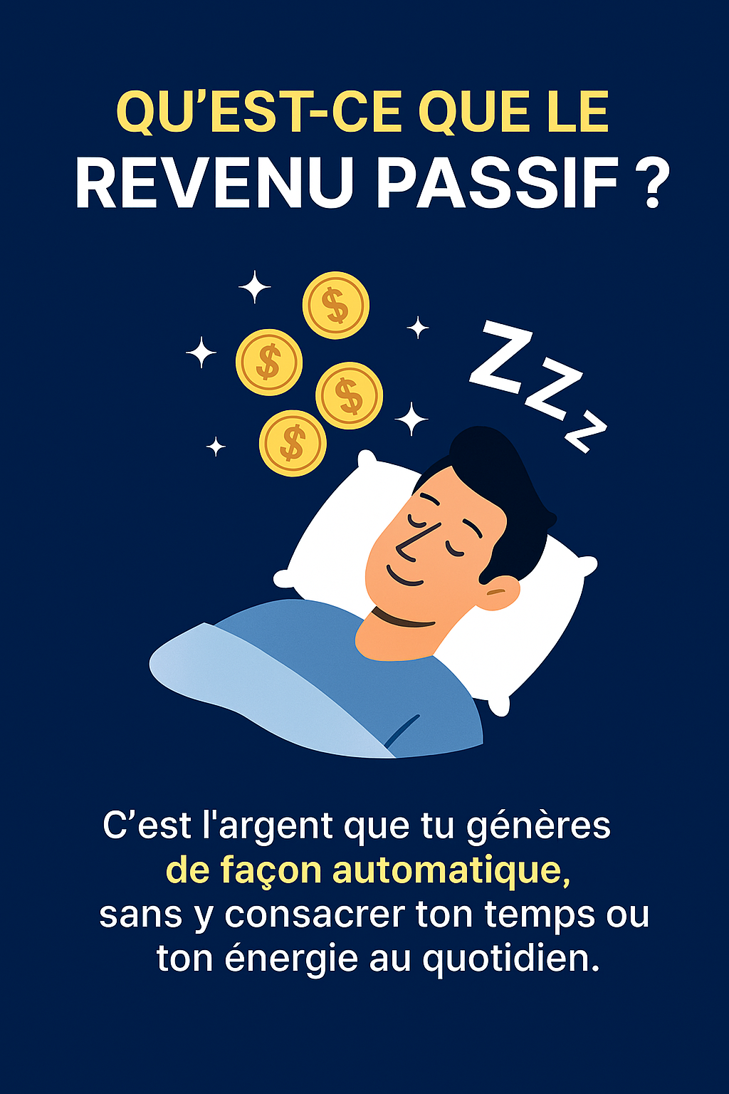 Le revenu passif est un revenu que tu continues de percevoir même lorsque tu n’es pas en train de travailler activement. Contrairement au revenu actif (comme un salaire ou une prestation de service), il ne dépend pas directement du temps que tu y consacres chaque jour.